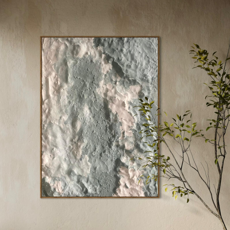 Breng diepte en karakter in je interieur met deze unieke 3D-wanddecoratie. Het kunstwerk combineert zachte crèmetinten met subtiel groen en creëert door de rijke reliëfstructuur een levendig spel van licht en schaduw. De…