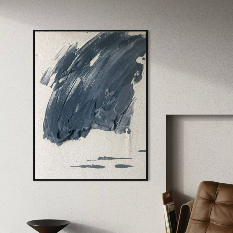 Strak, krachtig en modern, deze handgemaakte 3D-wanddecoratie voegt een uniek statement toe aan je interieur. Het kunstwerk bestaat uit blauwtinten op een lichte grijze achtergrond, waardoor een stijlvol contrast en een levendig…